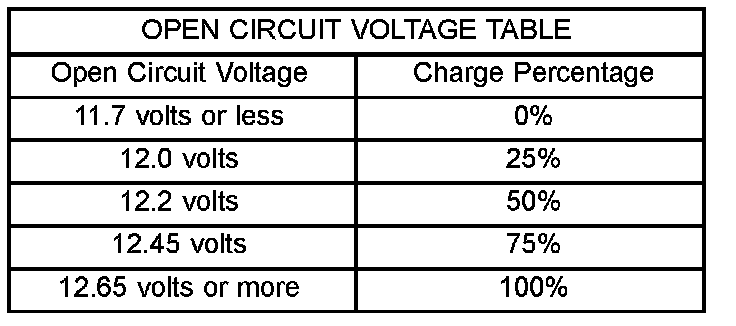 See the Open-Circuit Voltage Table. This voltage reading will indicate the battery state-of-charge, but will not reveal its cranking capacity. If a battery has an open-circuit voltage reading of 12.4 volts or greater, it may be tested to reveal its cranking capacity. Refer to Standard Procedures for the proper Micro 420 battery test procedures.