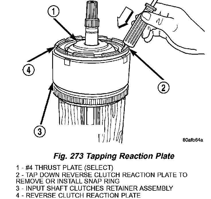 2. Tap down reverse clutch reaction plate to release pressure from snap ring (Fig. 273).