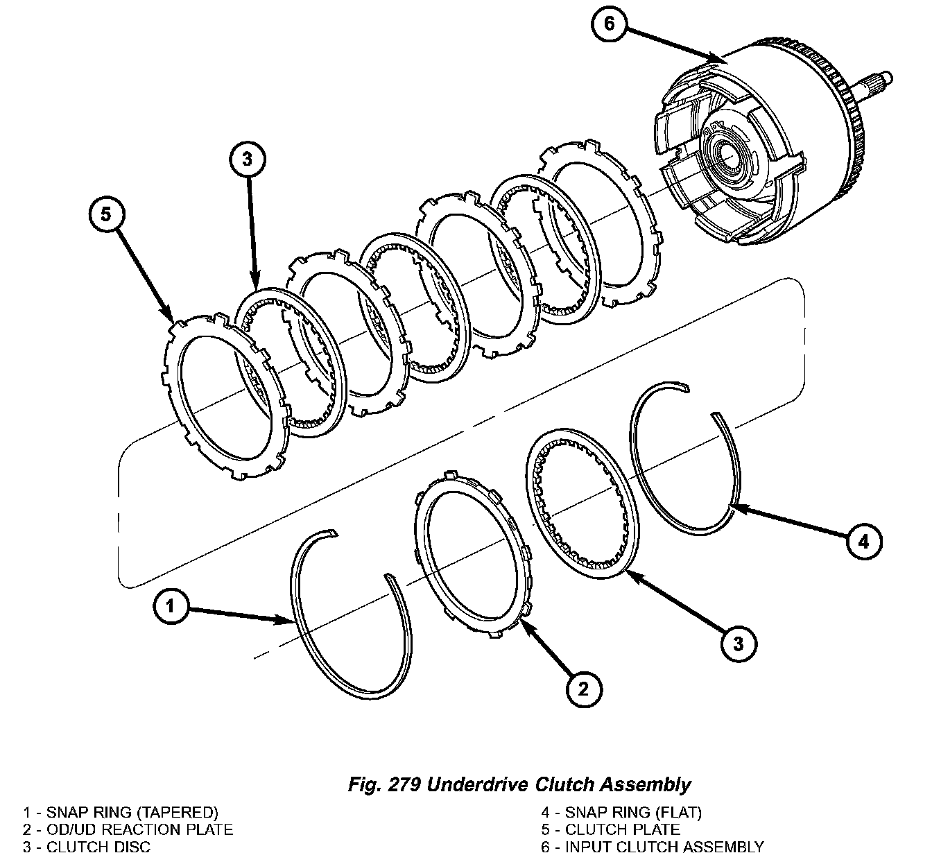 12. Remove the UD clutch flat snap ring and rest of UD clutch pack (Fig. 279). Tag clutch pack for assembly identification.