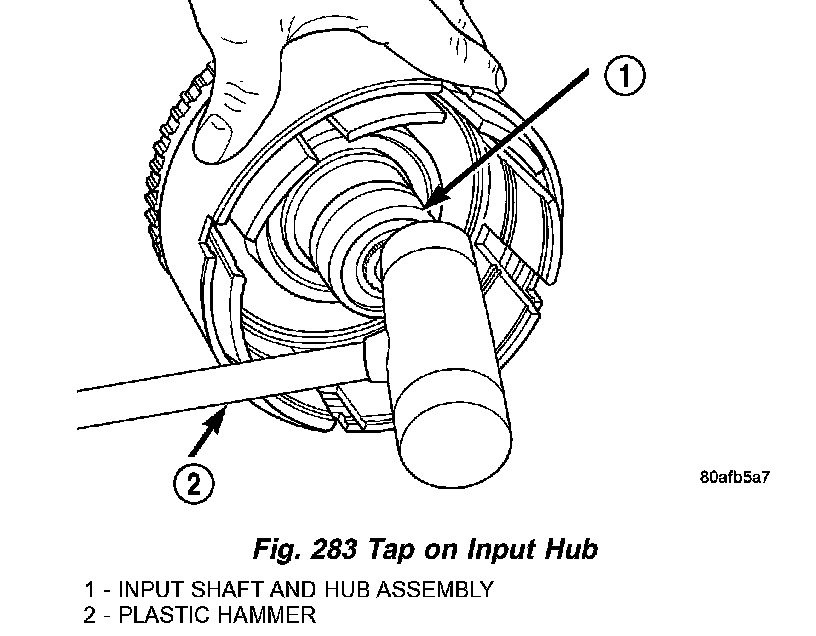 16. Tap on input hub with soft faced hammer and separate input hub from OD/Reverse piston and clutch retainer (Fig. 283).