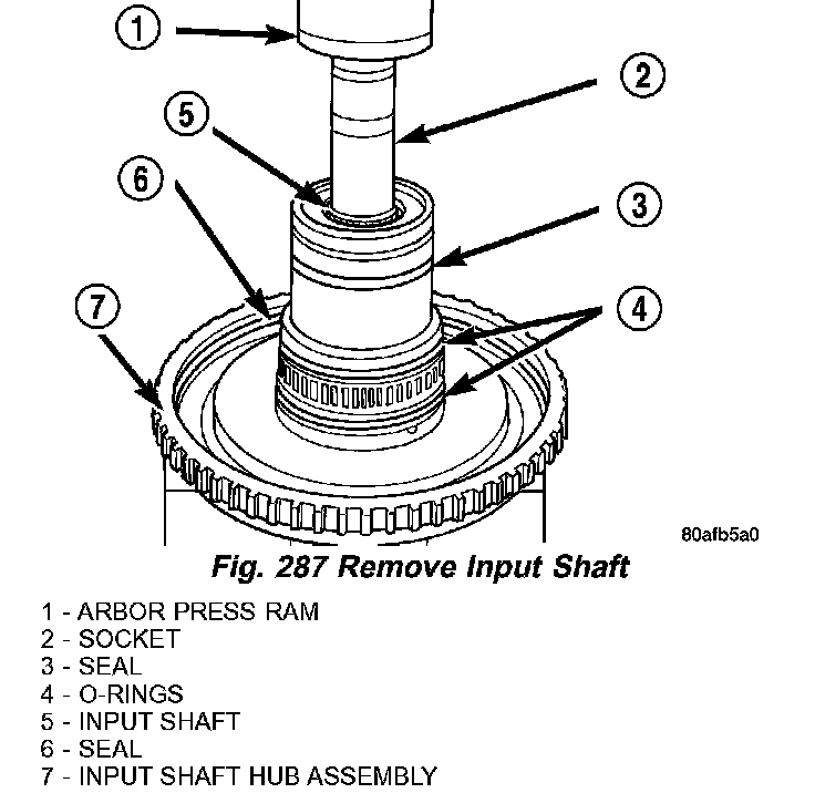 20. Using a suitably sized socket and an arbor press, remove input shaft from input shaft hub (Fig. 287).