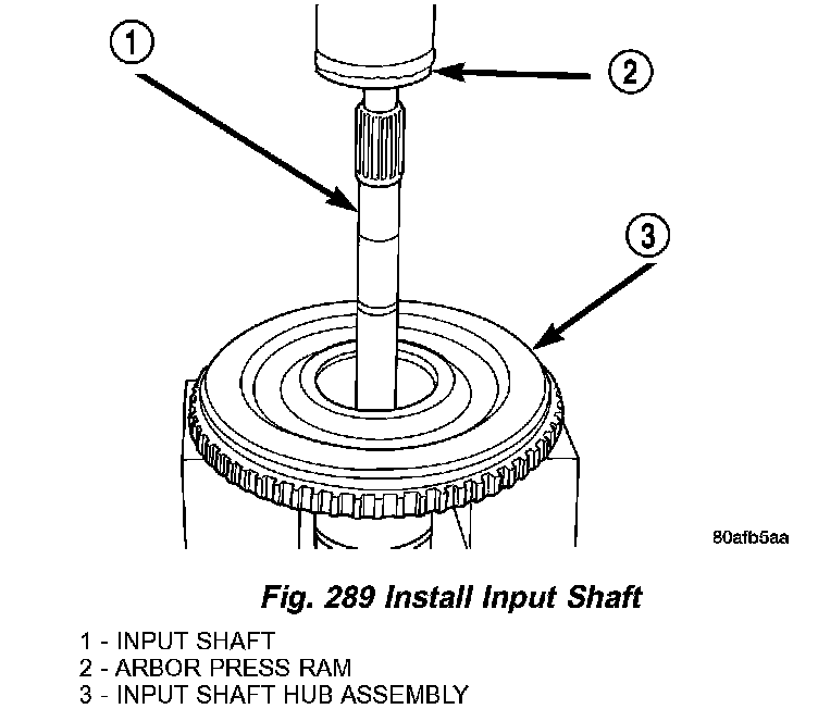 1. Using an arbor press, install input shaft to input shaft hub (Fig. 289).