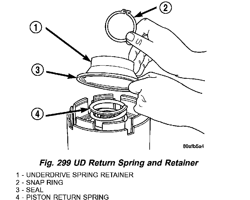 9. Using Tool 5059A and an arbor press, Install the UD spring retainer and snap ring (Fig. 299) (Fig. 300) (Fig. 301) Compress just enough to install snap ring.
