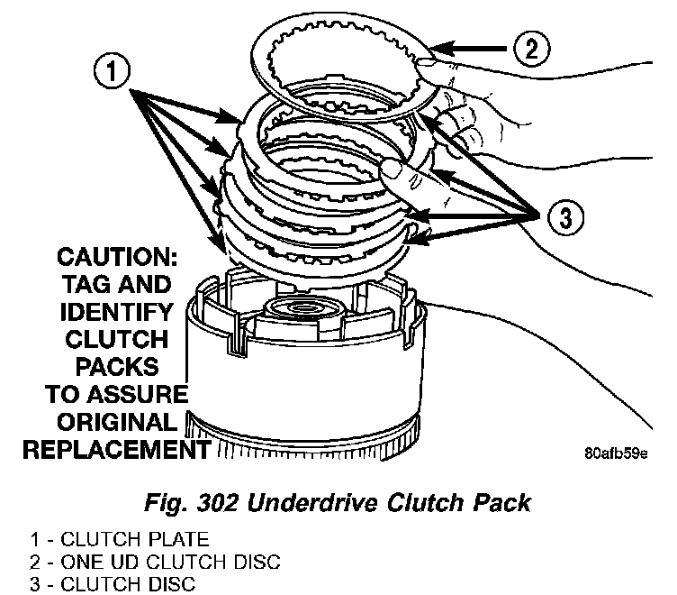 10. Install the UD clutch pack. Leave out upper disc, until snap ring is installed (Fig. 302).