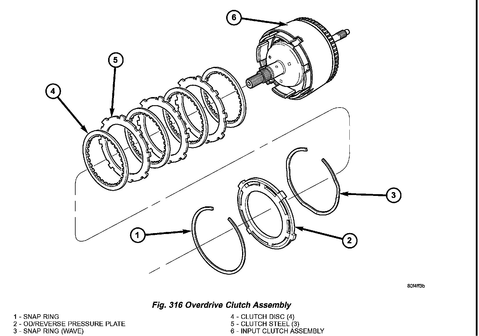 21. Install the OD clutch pack (four frictions/three steels) (Fig. 312).