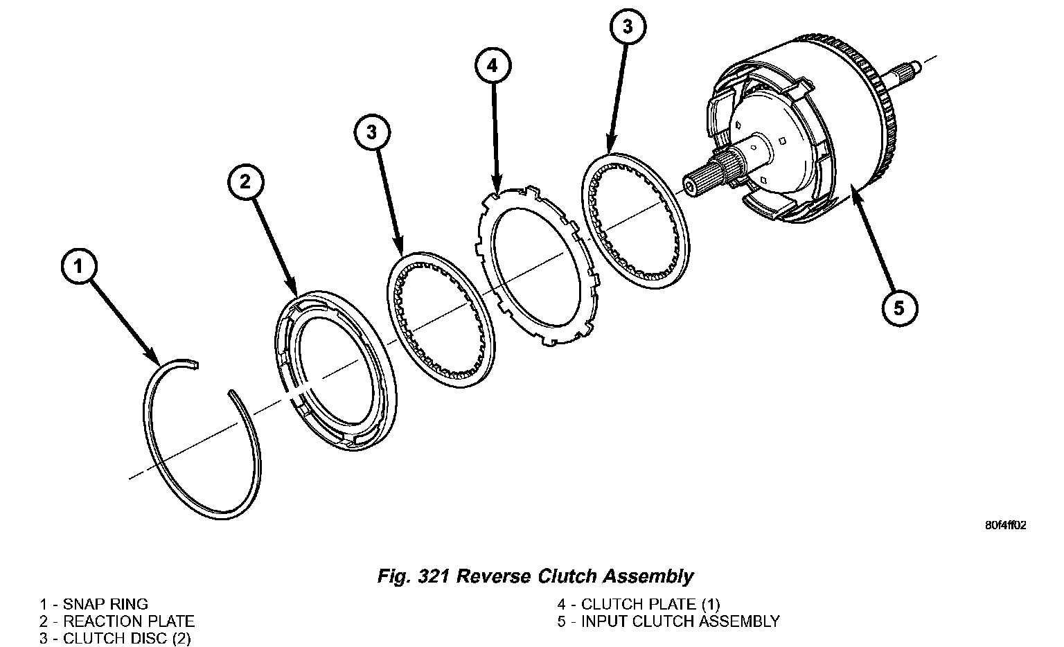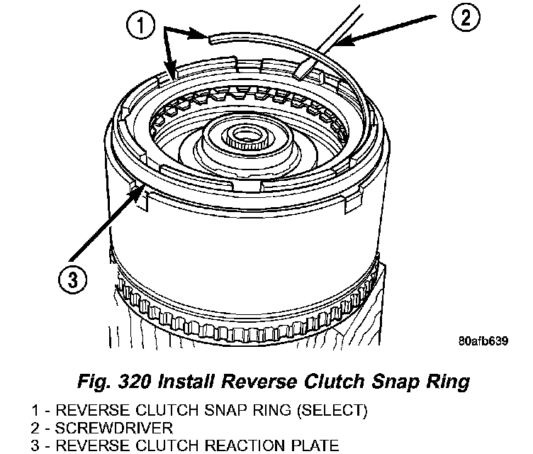 30. Tap reaction plate down to allow installation of the reverse clutch snap ring. Install reverse clutch snap ring (Fig. 320) (Fig. 321).