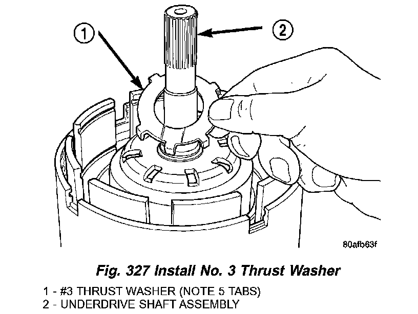 39. Install the #3 thrust washer to the underdrive shaft assembly. Be sure five tabs are seated properly (Fig. 327).
