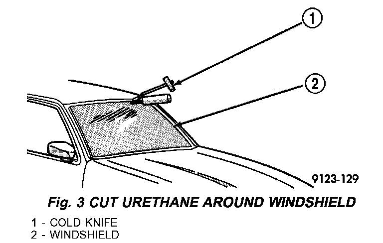 4. Using a sharp cold knife, cut urethane adhesive attaching the liftgate glass to the liftgate. A power cutting device can be used if available (Fig. 3).