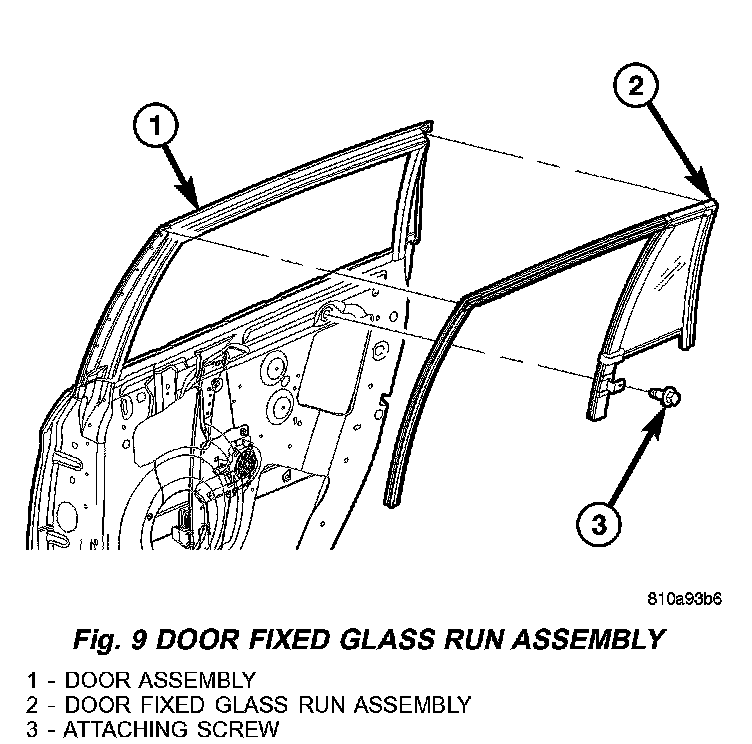 7. Remove screw attaching glass run to door panel (Fig. 9).