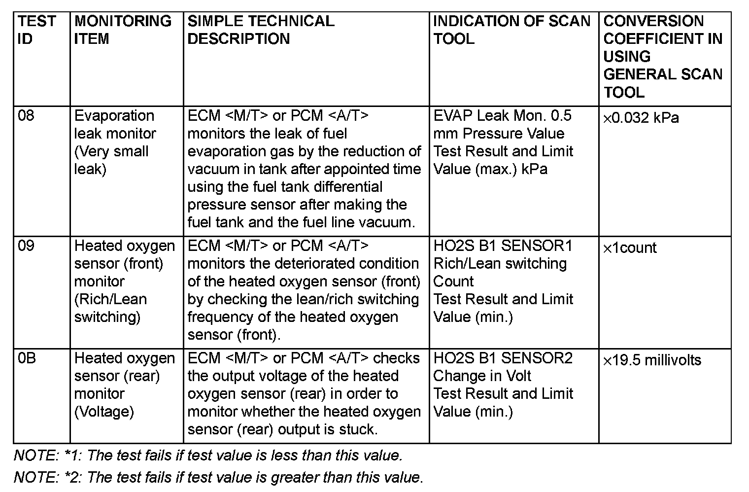 By selecting MODE 6 using scan tool, Test Result and Limit Value (minimum) *1 or (maximum) *2 about the main items of emission control system which ECM