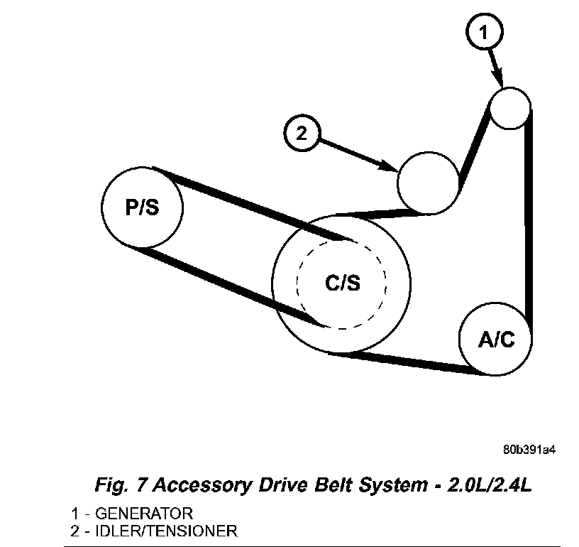 4. Gently apply a force to rotate belt tensioner clockwise until the belt tensioner bottoms out and the belt can be removed from pulleys (Fig. 4) or (Fig. 5).