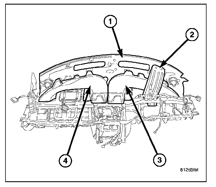 4. Remove the four screws that secure the passenger side instrument panel duct and demister duct assembly (4) to the instrument panel and remove the duct assembly.