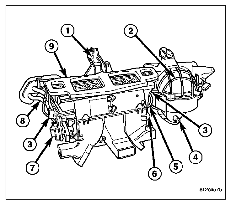 All vehicles are equipped with a common heater, ventilation and air conditioning (HVAC) housing (1). The heating-A/C system combines A/C, heating, and ventilating capabilities in a single HVAC housing mounted within the passenger compartment beneath the instrument panel. The HVAC housing includes:
