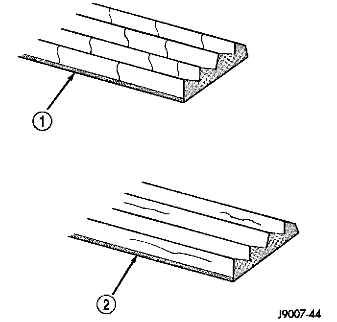 When diagnosing serpentine accessory drive belts, small cracks (1) that run across the ribbed surface of the belt from rib to rib, are considered normal. These are not a reason to replace the belt. However, cracks (2) running along a rib (not across) are not normal. Any belt with cracks running along a rib must be replaced. Also replace the belt if it has excessive wear, frayed cords, severe glazing or chunking.