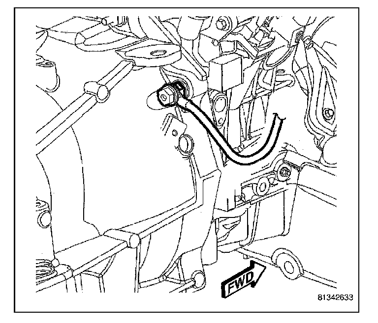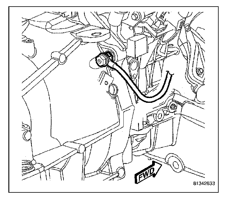 6. Remove the fastener securing the battery negative cable to the transmission housing.