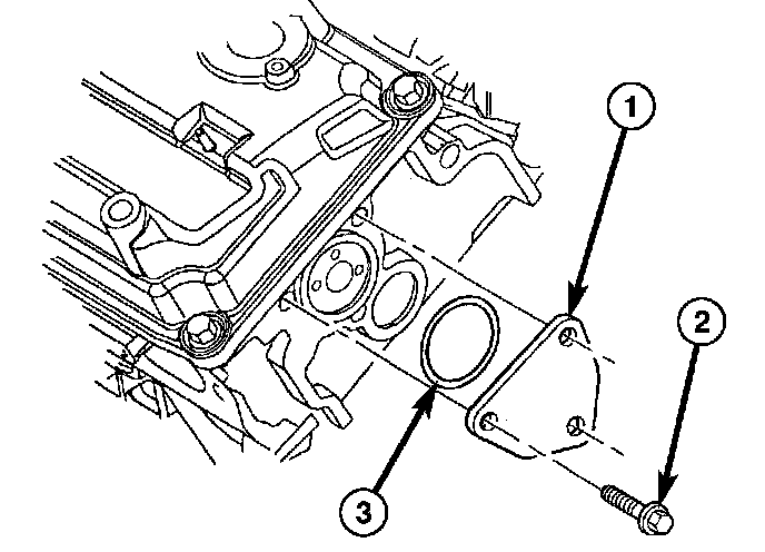 2. Install the camshaft thrust plates (1) and O-ring (3). Tighten bolts (2) to 28 Nm (250 inch lbs.).