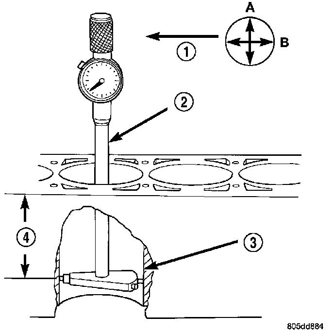 2. Measure the inside diameter of the cylinder bore at a point 38.0 mm (1.5 inches) below top of bore. Start perpendicular (across or at 90 degrees) to the axis of the crankshaft at point A and then take an additional bore reading 90 degreesto that at point B.