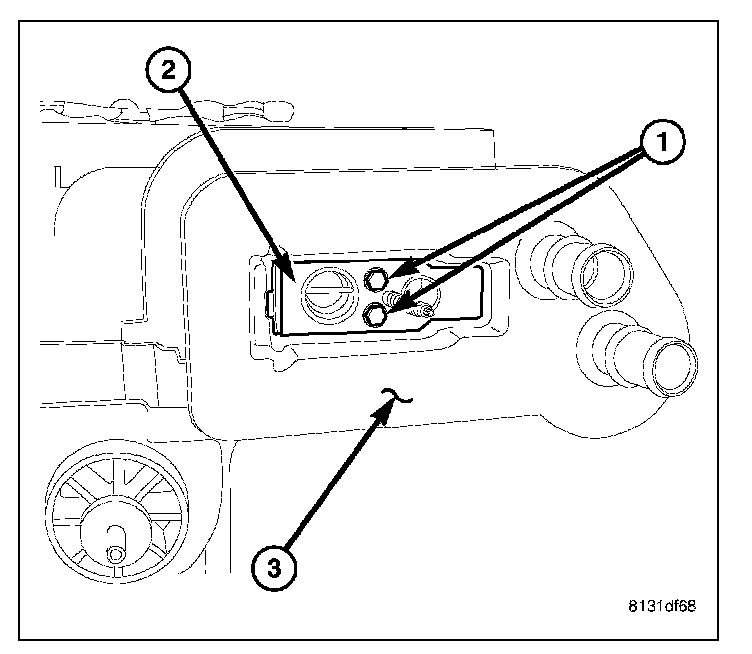 9. Remove the two bolts (1) that secure the A/C expansion valve (2) to the evaporator tube tapping block located within the foam seal (3).