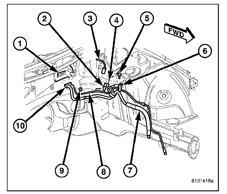 9. Install the bolt (5) that secures the refrigerant line mounting bracket (6) to the left front shock tower (4) Tighten the bolt to 11 N.m (100 in.lbs.).