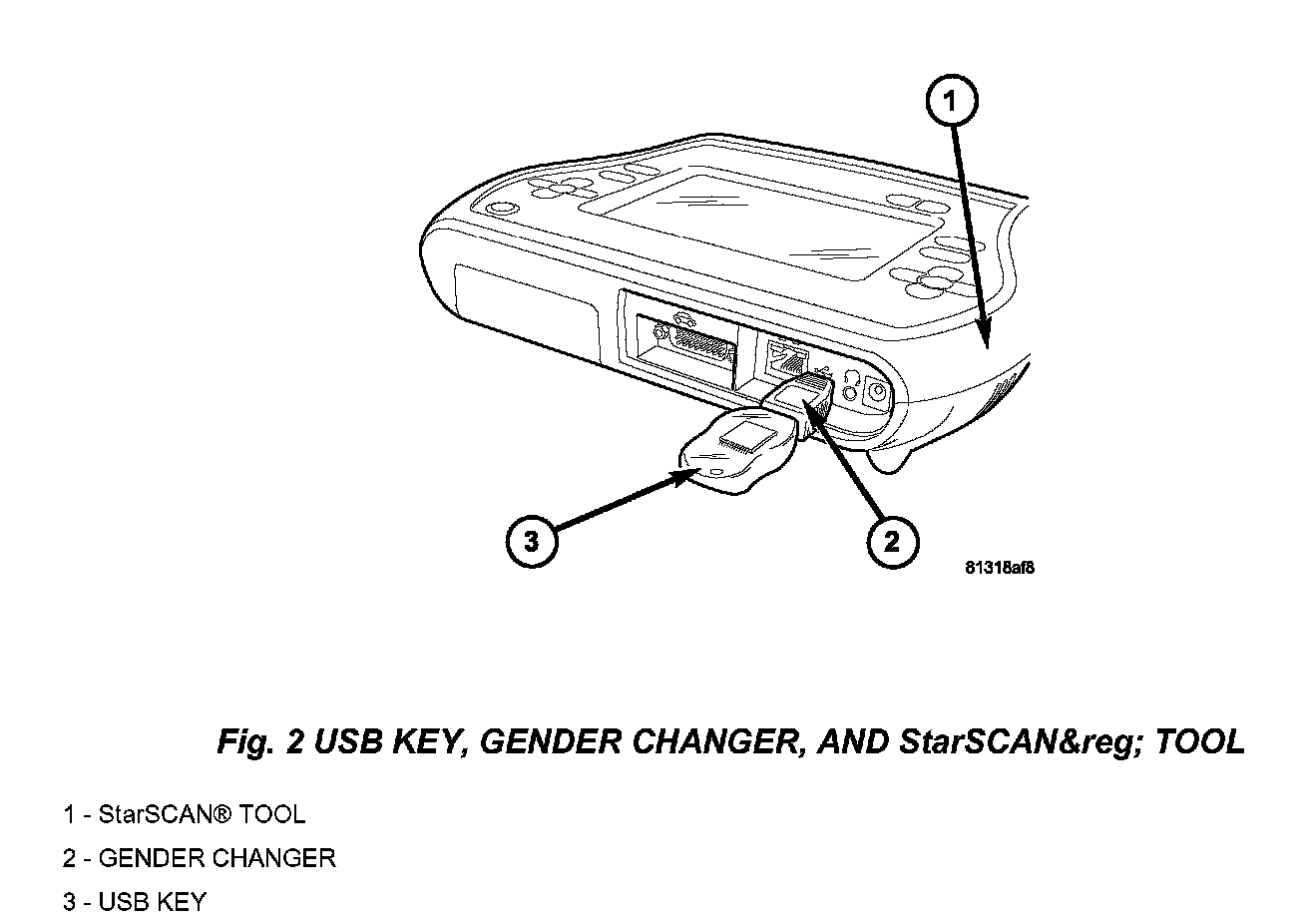 8. With the StarSCAN(R) powered OFF, connect the USB Key and Gender Changer to the StarSCAN(R) USB port, (Fig. 2).