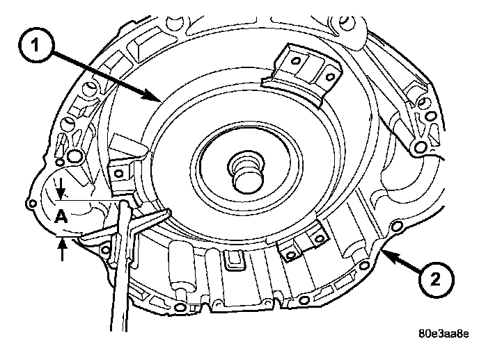 8. Check converter seating with a scale and straightedge (A). Surface of converter lugs should be at least 19 mm (3/4 inch) to rear of straightedge when converter is fully seated.