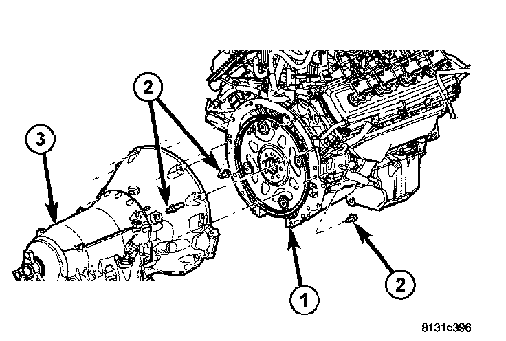 12. Raise transmission (3) and align the torque converter with the drive plate and the transmission converter housing with the engine block (1).