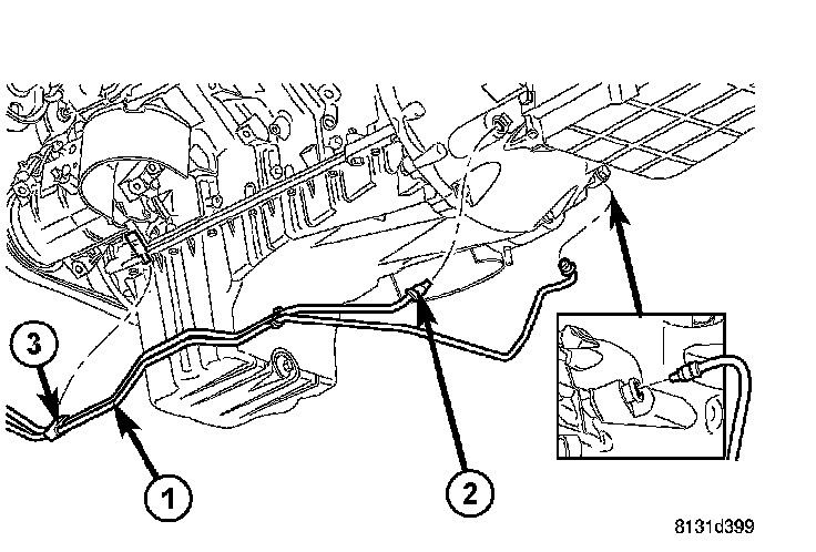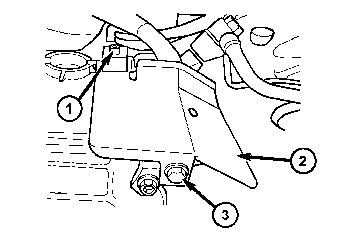 25. Position the heat shield (2) onto the transmission housing and install the screw (1) and bolt (3) to hold the shield in place.