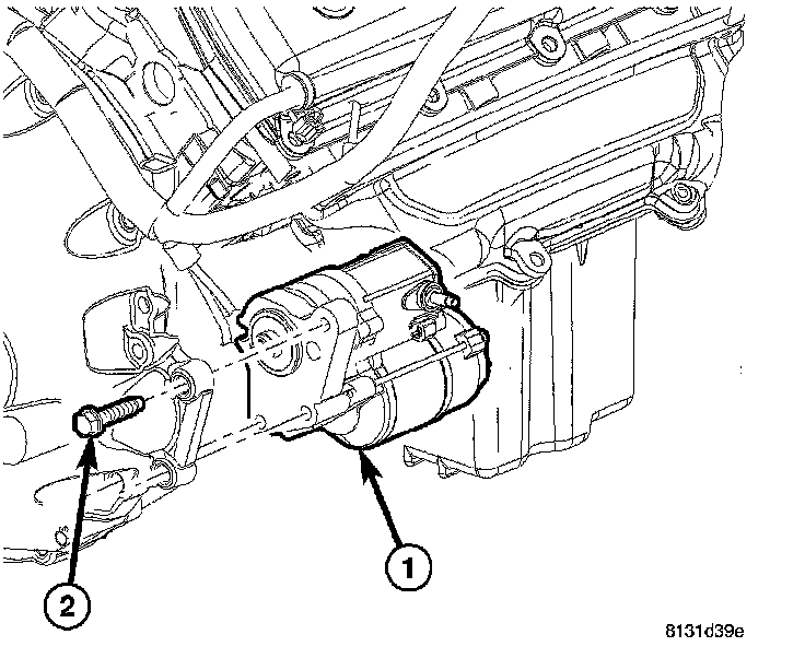 16. Install remaining torque converter housing to engine bolts (2). Tighten to 39 Nm (29 ft. lbs.).