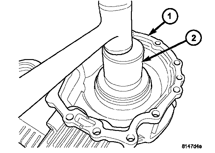 33. Install the rear output shaft seal from the transfer case cover (2) with Installer C-3860A (1).