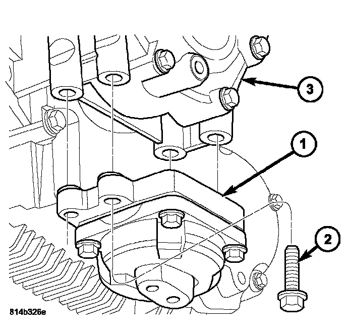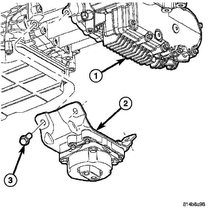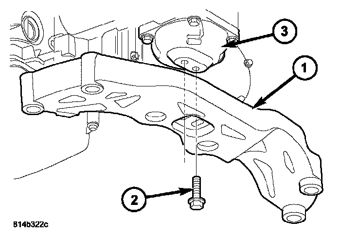 9. Install the transmission mount assembly to the transfer case and install the bolts (3) to hold the transmission mount assembly (2) to the transfer case (1), 3.5L engine. Tighten the bolts to 55 Nm (41 ft. lbs.).