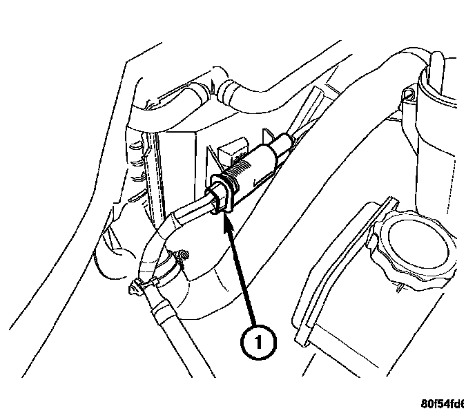 3. Remove the coolant return hose (1) from the mounting bracket (2).