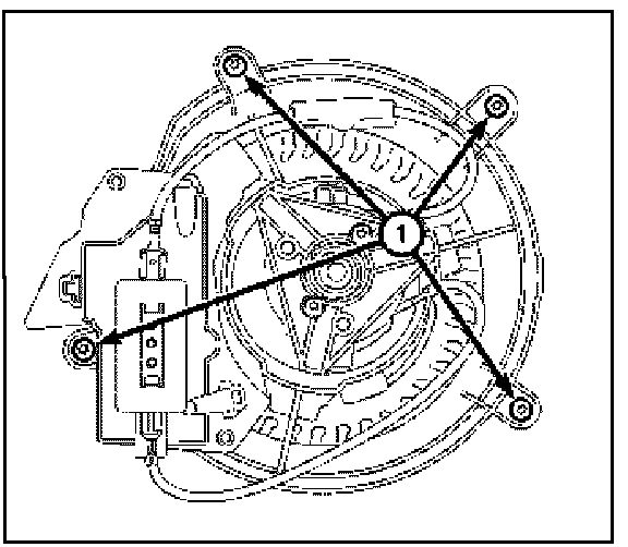 5. Remove the screws (1) attaching the blower motor to the heater housing.