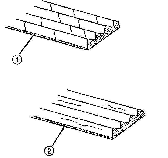 ^ Severe glazing The accessory drive belt may develop minor cracks across the ribbed side (1) due to reverse bending. These minor cracks are considered normal and acceptable. Parallel cracks (2) are not considered normal and should be cause for belt replacement.