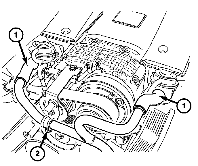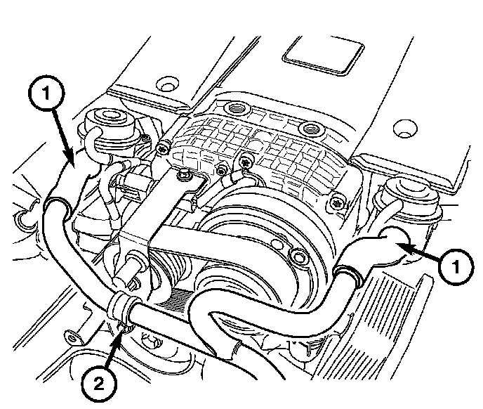 7. Remove the supercharger idler pulley upper retaining bolt (1) and lower retaining bolt (2).