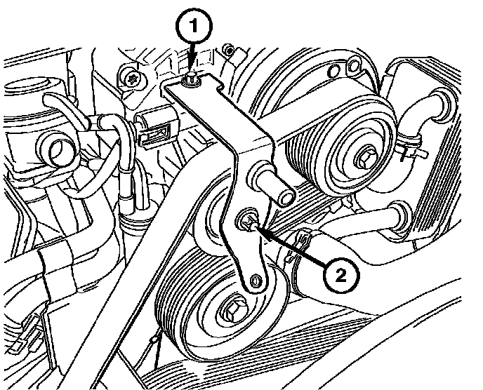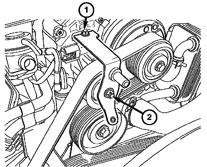 2. Install the supercharger idler pulley upper mounting bolt (1) and the lower mounting bolt (2). Tighten the bolts to 20 Nm (15 ft. lbs.).