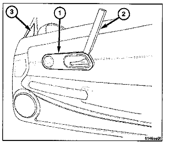 2. Remove the release handle bezel (1) from the trim panel by prying the cover from the door panel using a trim stick (2).