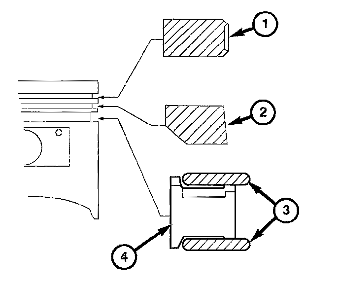 5. Install the rings on the pistons as shown. Compression ring (1) Sealing ring (2) Oil Ring Rail (3) Oil Ring Expander (4)