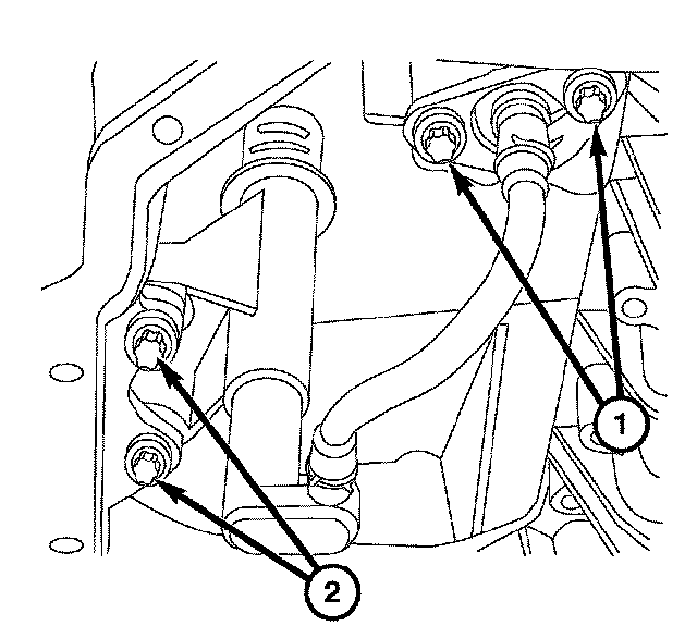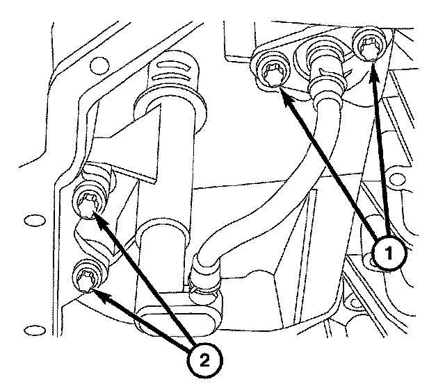 4. Remove the two harness retainer screws (2) and the oil level/temperature sensor.