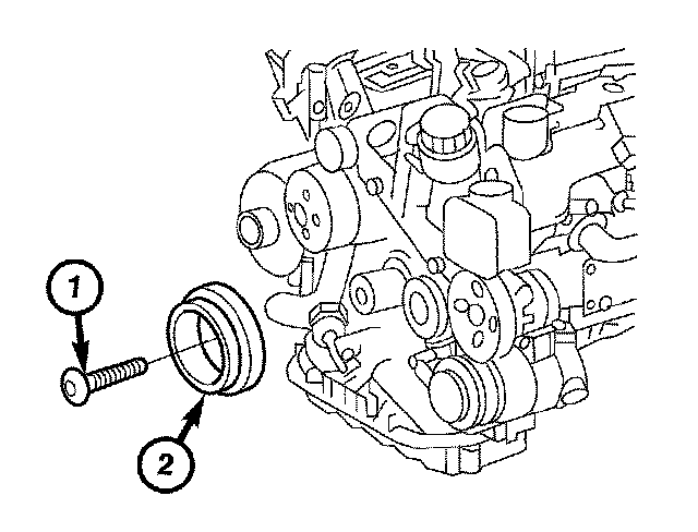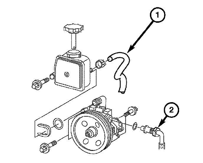 14. Install the power steering pump, return hose (1), and pressure hose (2)