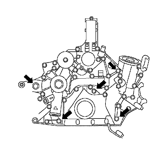 Note: Ensure that the bolts indicated by the arrows are installed with thread sealer prior to assembly.