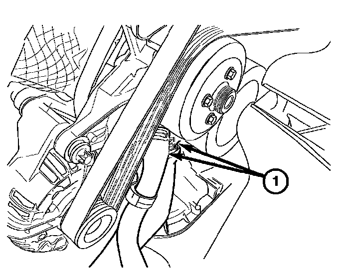 7. Install the idler pulley (1) and bolt. Tighten the idler pulley bolt to 10 Nm (89 inch lbs.).