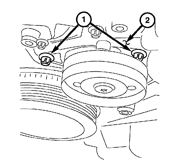 6. Install the water pump pulley (2) and bolts. Tighten the water pump pulley bolts to 10 Nm (89 inch lbs.).