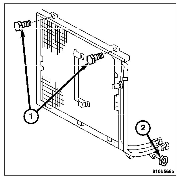 The condenser is located in the air flow in front of the engine cooling radiator. The condenser transforms the refrigerant from gaseous into liquid. It is attached to the vehicle with two bolts (1) and to the A/C lines with fittings.