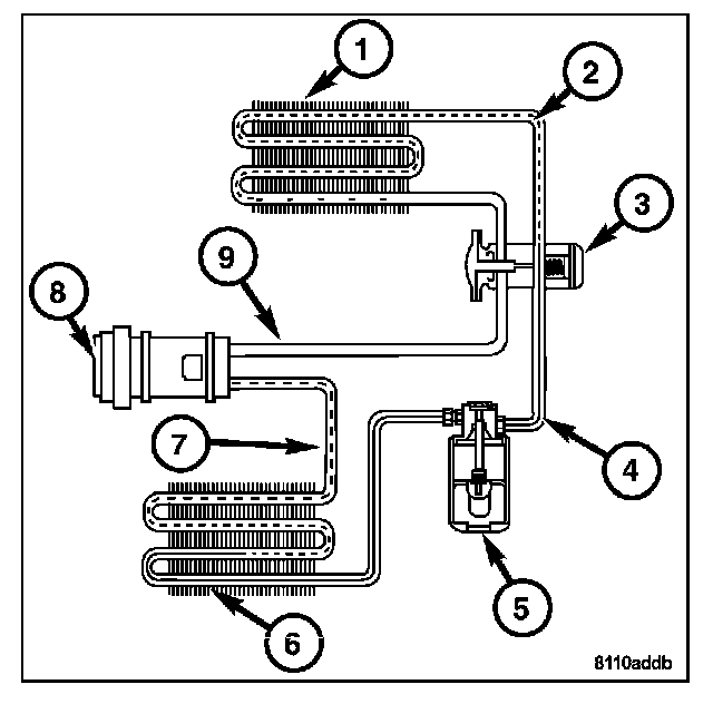 When the refrigerant gas (7) gives up its heat, it condenses. When the refrigerant leaves the condenser (6), it has become a high-pressure liquid refrigerant (4). The volume of air flowing over the condenser fins (6) is critical to the proper cooling performance of the air conditioning system. Therefore, it is important that there are no objects placed in front of the radiator grille openings in the front of the vehicle or foreign material on the condenser fins (6) that might obstruct proper air flow. Also, any factory-installed air seals or shrouds must be properly reinstalled following radiator or condenser service.