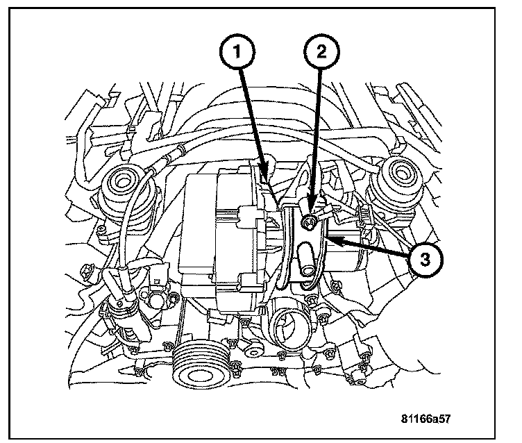 2. Install the air pump retaining bolt (2). Tighten bolt to 20 N.m (177 in. lbs.).