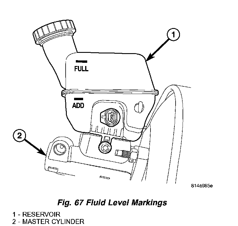 Although there is a range, the preferred level is FULL. As necessary, adjust the brake fluid level to the FULL mark listed on the side of the master cylinder fluid reservoir (Fig. 67). Do not overfill the system.