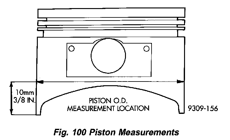 Piston and cylinder wall must be clean and dry. Piston diameter should be measured 90 degrees to piston pin at size location shown in (Fig. 100). Cylinder bores should be measured halfway down the cylinder bore and transverse to the engine crankshaft center line. Pistons and cylinder bores should be measured at normal room temperature, 70°F (21°C).