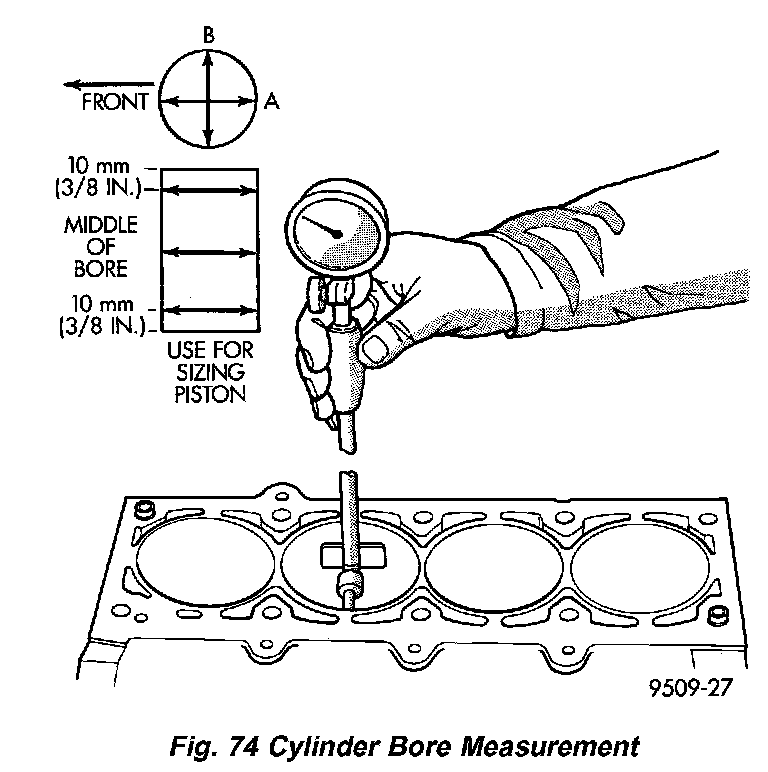 Measure the cylinder bore at three levels in directions A and B (Fig. 74). Top measurement should be 10 mm (3/8 inch) down and bottom measurement should be 10 mm (3/8 inch) up from bottom of bore.