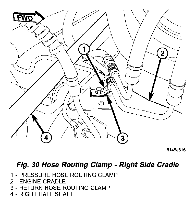 7. Remove screw securing pressure and return hose clamps to right side of engine cradle (Fig. 30).