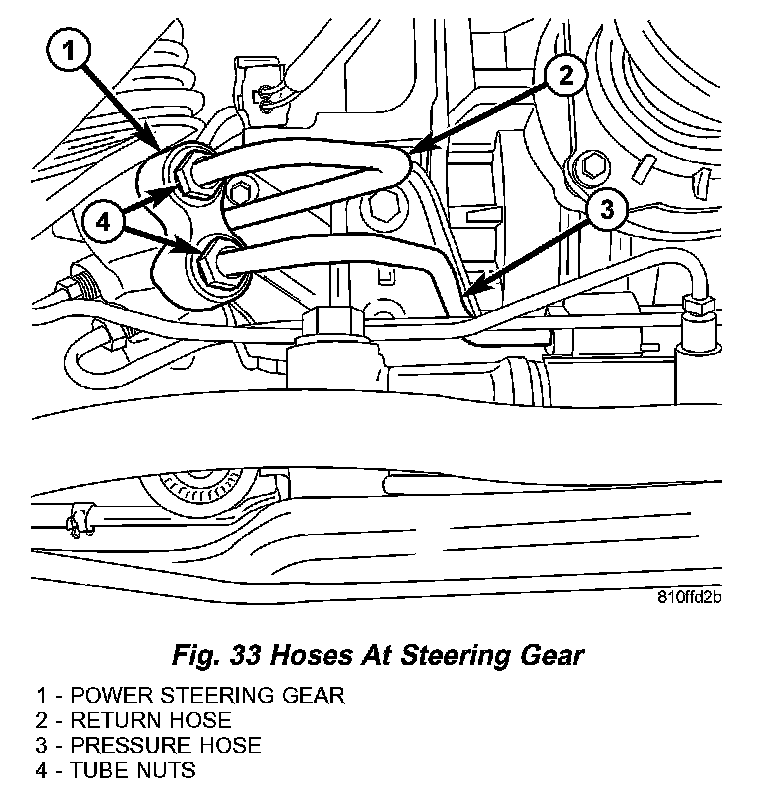 10. Remove tube nut fastening return hose to power steering gear (Fig. 33). Remove return hose from gear port.